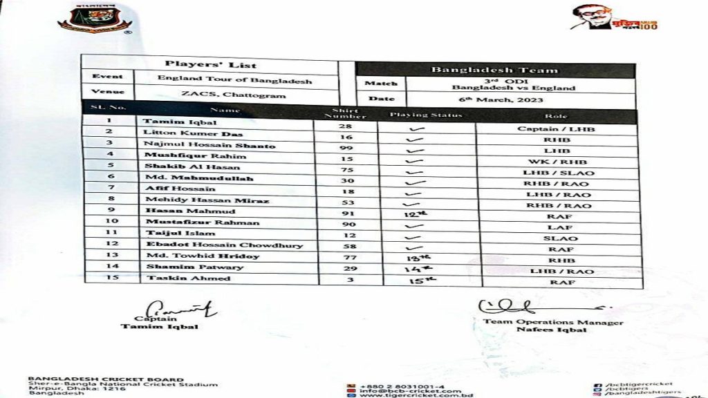 বাংলাদেশ-ইংল্যান্ড তৃতীয় ও শেষ ওয়ানডের টিম শিটের ১৪ নম্বরে ছিল শামীম পাটোয়ারীর নাম। এমনকি, দলে না থাকা এই ক্রিকেটারের নাম দেয়া হয়েছে নিয়মিত সদস্য তাসকিনের আগেই! অথচ, তৃতীয় ওয়ানডের স্কোয়াডে তাকে অন্তর্ভুক্ত করেনি বাংলাদেশ ক্রিকেট বোর্ড।