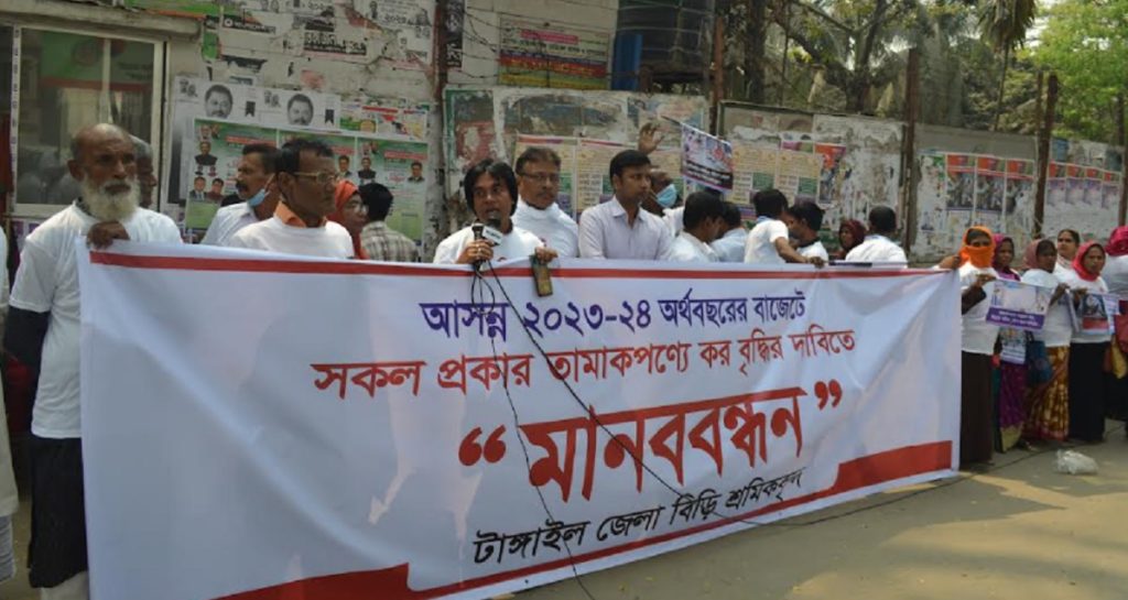 জনস্বাস্থ্য রক্ষায় এবং প্রধানমন্ত্রী ঘোষিত ২০৪০ সালের পূর্বে বাংলাদেশকে তামাকমুক্ত করার অঙ্গীকার বাস্তবায়নের লক্ষ্যে আসন্ন ২০২৩-২৪ অর্থবছরের বাজেটে সব ধরনের তামাকজাত পণ্যের কর ও মূল্য উচ্চ হারে বাড়ানোর দাবিতে মঙ্গলবার (১৪ মার্চ) জাতীয় প্রেস ক্লাবের সামনে মানববন্ধন করেছেন টাঙ্গাইল জেলার বিড়ি শ্রমিকগণ।