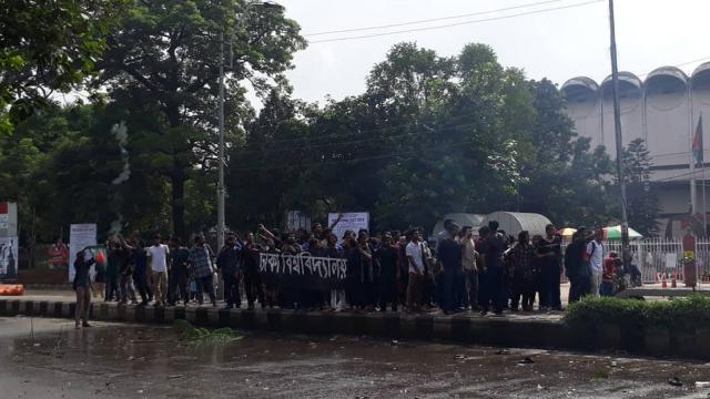 প্রত্যক্ষদর্শীরা জানান, ঢাকা বিশ্ববিদ্যালয় এলাকা থেকে বের হওয়া একটি মিছিল শাহবাগ মোড়ে পৌঁছানোর আগেই পুলিশের বাধার মুখে পড়ে। জলকামান ব্যবহার করে ও কাঁদানে গ্যাসের শেল ছুড়ে মিছিলকারীদের ছত্রভঙ্গ করে দিয়েছে পুলিশ। এসময় পুলিশের দিকে ইটপাটকেল ছোঁড়েন আন্দোলনাকারীরা।