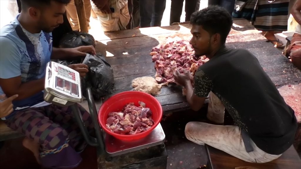 বগুড়ার গাবতলী উপজেলার কদমতলী মোড়ে কালু কসাইয়ের দোকানে এমন দৃশ্য দেখা মেলে প্রতিদিন। ভোরের আলো ফোটার পর থেকে দুপুর পর্যন্ত বেচাকেনা চলে।