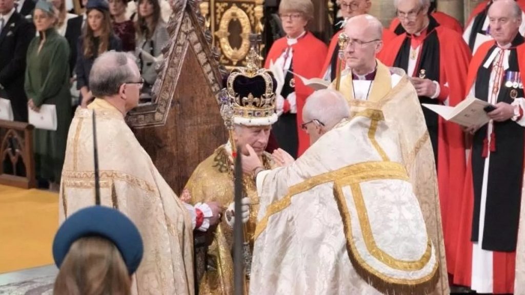 রাজা তৃতীয় চার্লস পবিত্র গসপেলে হাত রেখে শপথ নেন এবং আইনের শাসন ও চার্চ অব ইংল্যান্ডের মর্যাদা সমুন্নত রাখার অঙ্গীকার করেন।