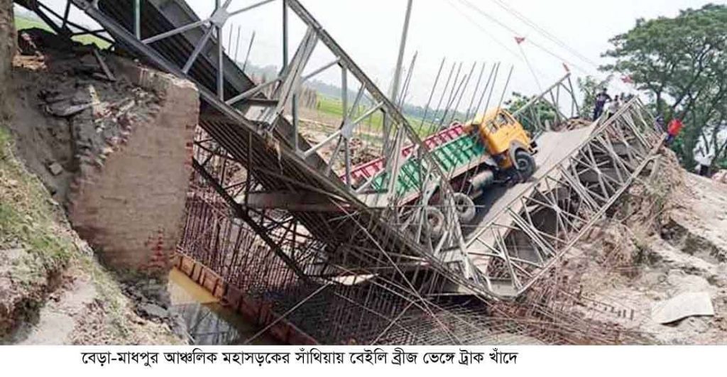 পাবনার বেড়া-মাধপুর আঞ্চলিক মহাসড়কের সাঁথিয়ার বোয়াইলমারী গোরস্থান নামক স্থানে সদ্য নির্মিত বেইলি ব্রিজ ভেঙ্গে ট্রাক খাদে পড়েছে। এতে যান চলাচলে বিঘ্ন ঘটায় ব্যবসায়ীসহ ঈদের ঘরে ফেরা মানুষেরা চরম দুর্ভোগে পড়েছে।