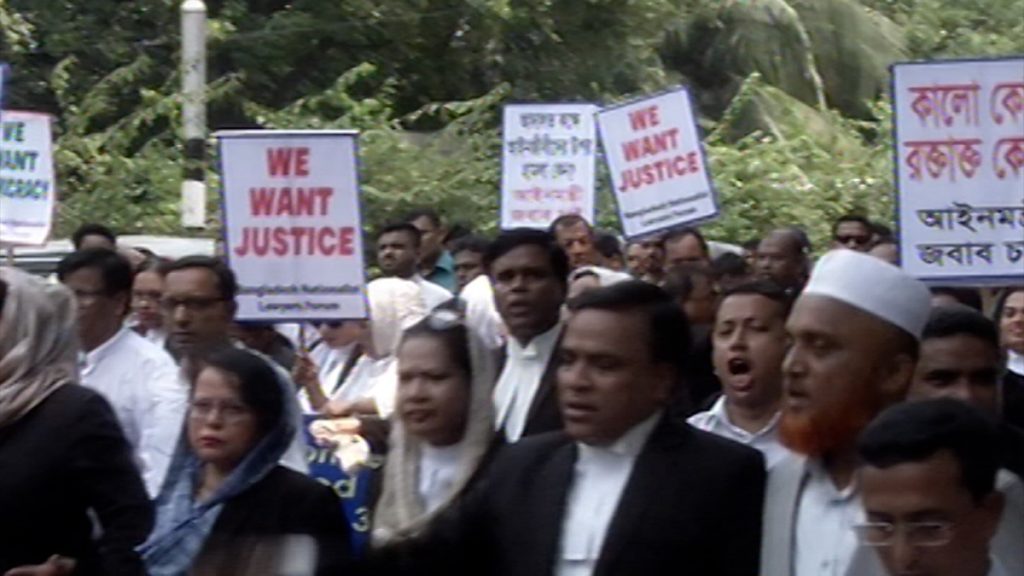 সুপ্রিম কোর্ট বার ভবনের সামনে থেকে তারা মিছিল বের করে। বিক্ষোভ মিছিলটি মৎসভবনের দিকে এগিয়ে গেলে পুলিশ তাতে বাধা দেয়। এ সময় বিভিন্ন স্লোগান দিয়ে মিছিল নিয়ে সড়কে অবস্থান নেয় তারা। পুলিশ সড়ক থেকে আইনজীবীদের সরিয়ে দিতে গেলে দুই পক্ষের মধ্যে হাতাহাতি হয়।