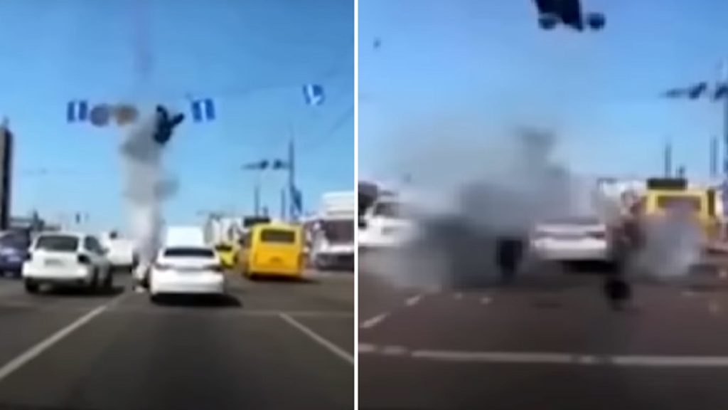 প্রায় ১ সপ্তাহ ধরে ইউক্রেনের রাজধানীতে কয়েকদফা মিসাইল হামলা চালাচ্ছে রাশিয়া। গত মাসে ইউক্রেনের রাজধানীতে ১৭ বার অভিযান চালায় রুশ সেনাবহর। এদিকে সোমবার লক্ষ্যবস্তুতে আঘাত হানার আগেই বিস্ফোরিত হয় একটি মিসাইল। আর এরই বড় একটি টুকরো সোজা এসে পড়ে রাস্তার মাঝখানে। মুহূর্তেই দুটি গাড়িতে ছড়িয়ে যায় আগুন।