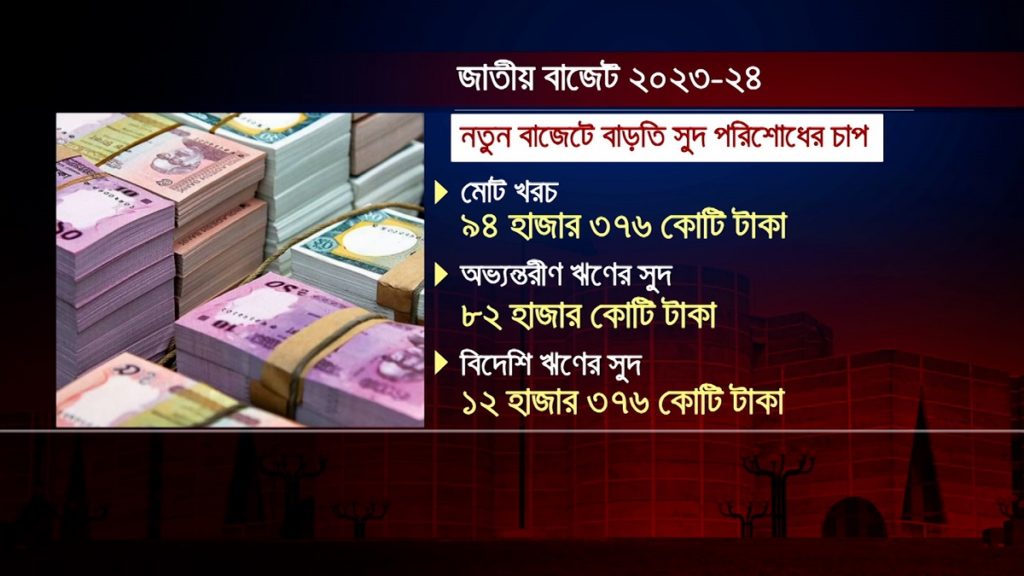 এই বাজেট বাস্তবায়নের বড় চ্যালেঞ্জ সুদের বাড়তি চাপ। আগামী অর্থবছরে সুদবাবদ খরচ হবে ৯৪ হাজার ৩৭৬ কোটি টাকা। এর মধ্যে ৮২ হাজার কোটি টাকা যাবে অভ্যন্তরীণ সুদে। আর বিদেশি ঋণে গুনতে হবে ১২ হাজার ৩৭৬ কোটি টাকা। ডলারের রেট বাড়ায় ২০ ভাগ অর্থ বেশি লাগবে বিদেশি ঋণের কিস্তি পরিশোধে।