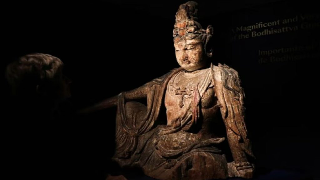 নিলামঘর বোনহ্যামসের দাবি, এটি চীনা সন্ন্যাসী গুয়ানিন বোধিসত্ত্বের মূর্তি। এটি বিরল প্রজাতির কাঠের তৈরি। এক মিটারেরও বেশি উচ্চতার এই মূর্তি সবশেষ গত শতাব্দির ৩০ এর দশকে প্যারিসে বসবাসরত এক পরিবারের কাছে বিক্রি করা হয়েছিল।