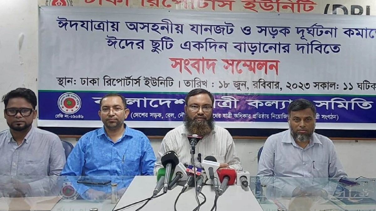 রোববার (১৮ জুন) সকালে ঢাকা রিপোর্টার্স ইউনিটিতে আয়োজিত সংবাদ সম্মেলনে এ দাবি জানানো হয়। তাতে যাত্রী কল্যাণ সমিতির মহাসচিব মোজাম্মেল হক বলেন, ঈদে ঢাকা, নারায়ণগঞ্জ ও গাজীপুর থেকে ১ কোটি ১০ লাখের বেশি মানুষ ঘরে ফিরবে। এছাড়া এক জেলা থেকে অন্য জেলায় যাতায়াত করবে আরও প্রায় ৪ কোটি মানুষ। তারা যাতে নিরাপদ ও স্বচ্ছন্দে চলাচল করতে পারে এজন্য ঈদের ছুটি একদিন বাড়িয়ে ২৭ জুন থেকে শুরু হোক।