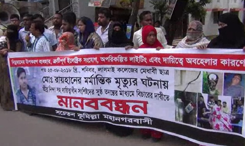 কুমিল্লায় পার্কে বিদ্যুৎস্পৃষ্ট হয়ে কলেজ ছাত্র রায়হানের মৃত্যুর ঘটনায় বিচারের দাবিতে মানববন্ধন অনুষ্ঠিত হয়েছে।