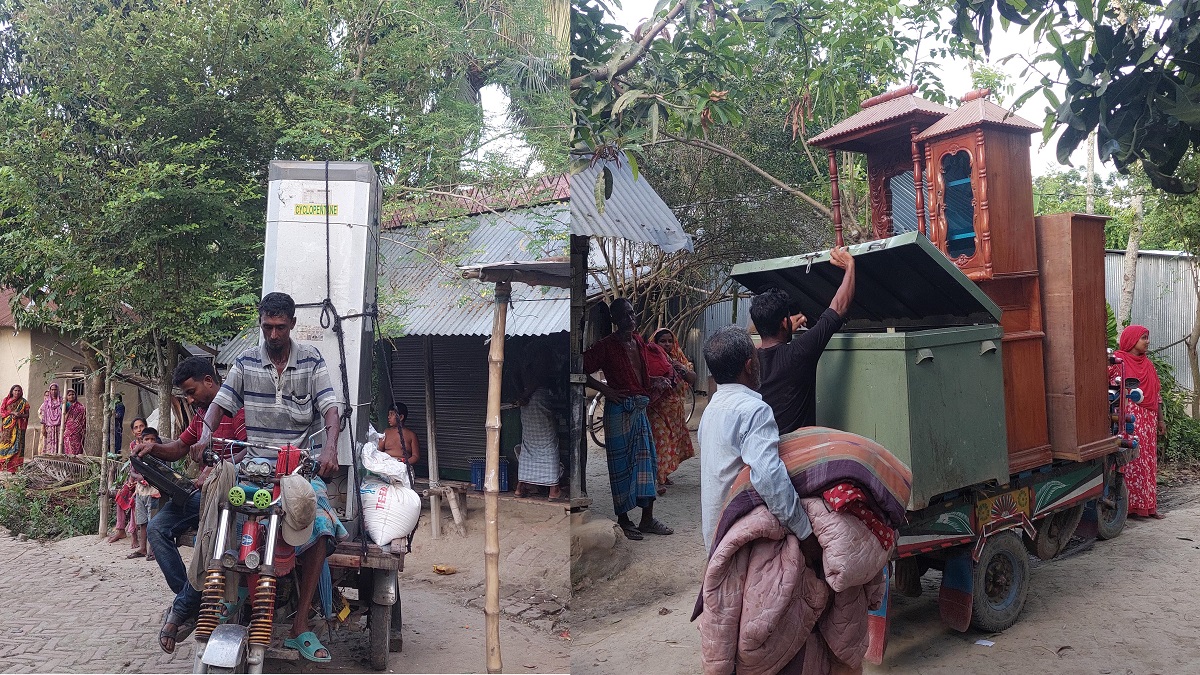 বাড়ির মূল্যবান জিনিসপত্র অন্যত্র সরিয়ে নিচ্ছেন গোপালপুর গ্রামের বাসিন্দারা। ছবি: যমুনা টিভি।