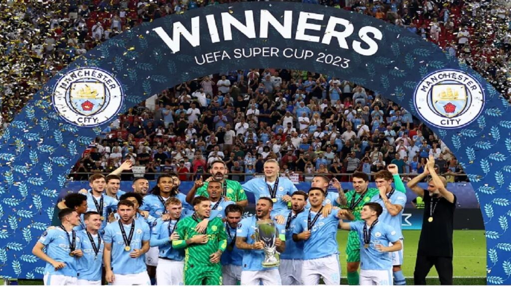 টাইব্রেকার রোমাঞ্চে প্রথমবার সুপার কাপ জিতলো ম্যানচেস্টার সিটি। নির্ধারিত সময়ে ১-১ গোলে শেষ হওয়া ম্যাচে সেভিয়াকে টাইব্রেকারে ৫-৪ গোলে হারায় পেপ গার্দিওলার দল।