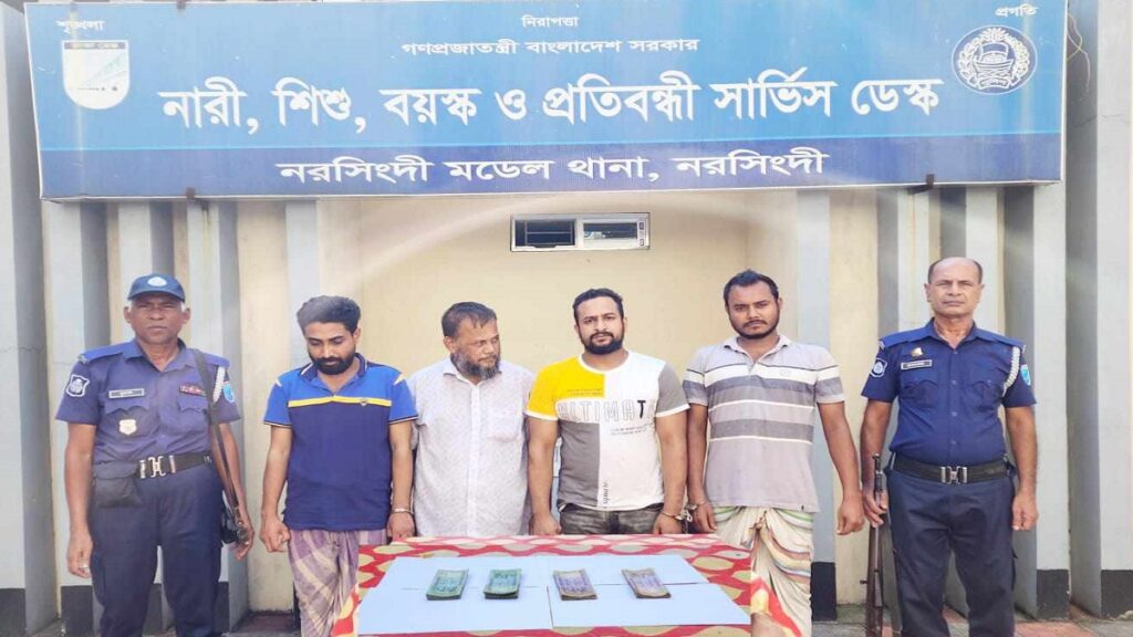 নরসিংদী মডেল থানার ওসি আবুল কাশেম জানান, গত ১৮ আগস্ট নরসিংদী শহরের ভেলানগর বাজারে ঢাকা-সিলেট মহাসড়কের ওপর পান ব্যবসায়ীকে কুপিয়ে প্রায় ৭ লক্ষাধিক টাকা ছিনতাইয়ের ঘটনা ঘটে। ঘটনার পরপরই জড়িতদের শনাক্ত করতে অভিযান পরিচালনা করে পুলিশ। সোমবার দিবাগত রাতে গোপন সংবাদের ভিত্তিতে বিভিন্ন স্থানে অভিযান চালিয়ে অভিযুক্ত ৪ জনকে গ্রেফতার করা হয়।