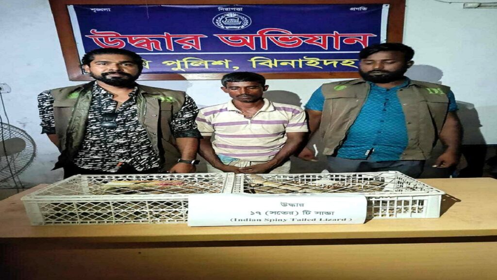 ঝিনাইদহ গোয়েন্দা পুলিশের অভিযানে বিরল প্রজাতির ১৭টি বন্যপ্রাণী সান্ডাসহ রাজ্জাক ওরফে রাজু (৩২) নামের এক চোরাকারবারিকে গ্রেফতার করা হয়েছে। জেলা পুলিশ সুপার আজিম-উল-আহসান এ তথ্য নিশ্চিত করে জানান, বৃহস্পতিবার (৫ সেপ্টেম্বর) রাতে জেলার মহেশপুর এলাকায় চেকপোস্ট বসিয়ে যানবাহনে তলাশি কার্যক্রম পরিচালনা করা হয়। সেসময় একটি বাসে তল্লাশি করা হয়। পরে বাসের ভেতর পেছনে বাম পাশের সিটে একজন ব্যক্তির কাছে থাকা ট্রাভেল ব্যাগের মধ্যে বন্যপ্রাণী সান্ডা দেখতে পেয়ে রাজ্জাক ওরফে রাজু নামের এক ব্যক্তিকে আটক করা হয়।