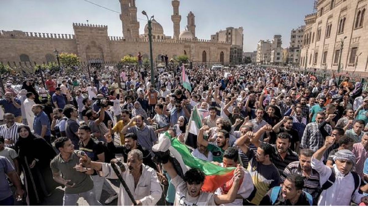 কায়রোর আজহার মসজিদের সামনে ফিলিস্তিনিদের সঙ্গে সংহতি জানিয়ে বিক্ষোভ করছে মিশরীয়রা। ছবি: রয়টার্স