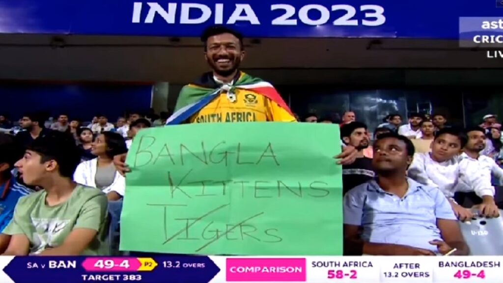 বিশ্বকাপে নিজেদের পঞ্চম ম্যাচে দক্ষিণ আফ্রিকার বিপক্ষে ৩৮২ রানের পাহাড়ের চাপে পড়ে মাত্র ৮১ রান তুলতেই ৬ উইকেট হারিয়ে ব্যাটিং বিপর্যয়ে পড়ে টাইগাররা। মঙ্গলবার (২৪ অক্টোবর) ওয়াংখেড়েতে বাংলাদেশের হার যখন প্রায় নিশ্চিত, তখন মুম্বাইয়ের গ্যালারিতে এক সমর্থকের প্ল্যাকার্ডে বাংলা টাইগার্স লেখাটির মধ্যে ‘টাইগার্স’ কেটে ‘কিটেনস’ লেখা দেখা গেছে।