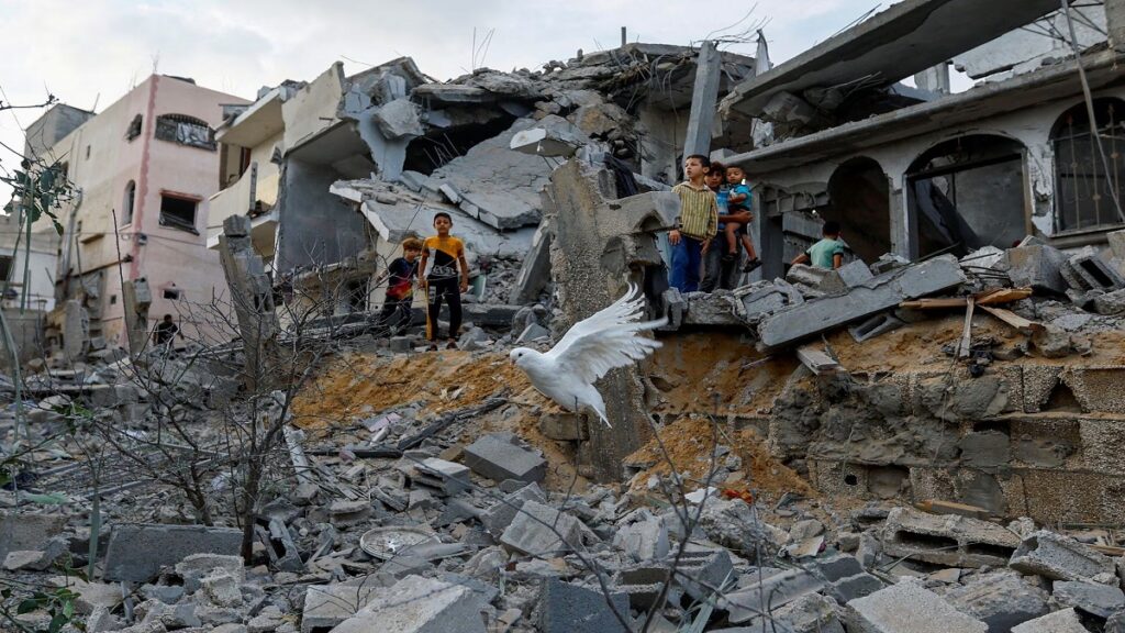 দক্ষিণ গাজা উপত্যকার খান ইউনিসে, ইসরায়েলি হামলায় বাড়ির ধ্বংসাবশেষের উপর দিয়ে একটি কবুতর উড়ছে। ছবি: রয়টার্স।