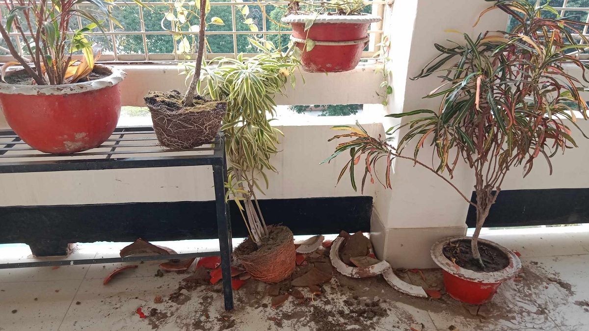 ছবি: ছাত্রলীগ কর্মীদের ভাঙচুর করা ফুলের টব
