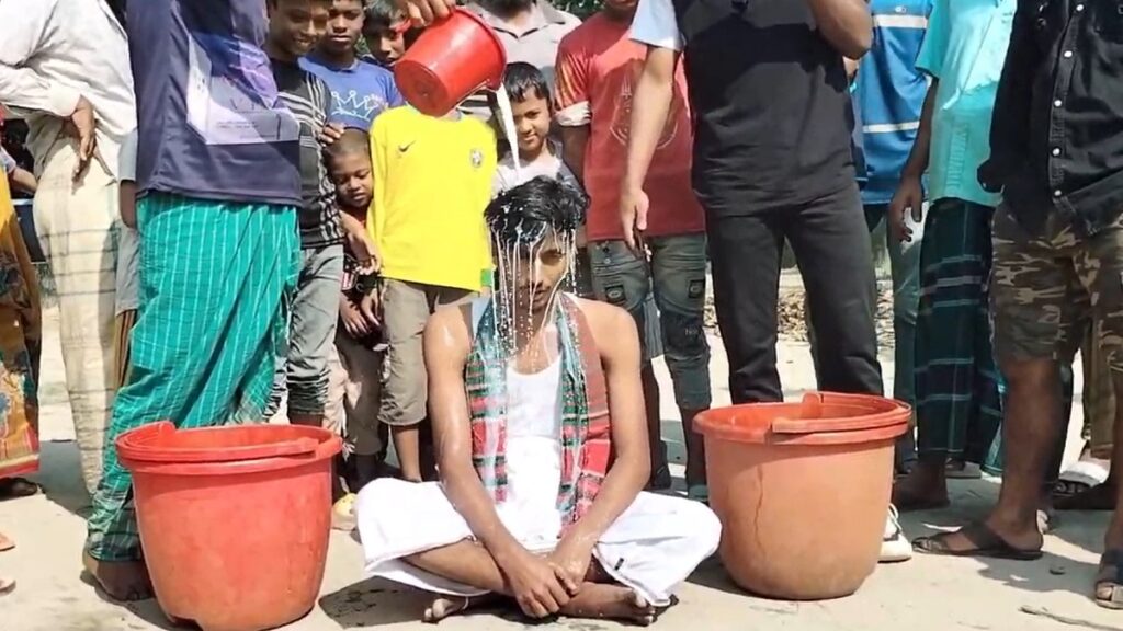 ঘটনাটি জামালপুরের মেলান্দহ উপজেলার কুলিয়া ইউনিয়নের পরগলি গ্রামের। দুধ দিয়ে গোসল করা ওই তরুণের নাম ইশান মাহমুদ শ্রাবন।