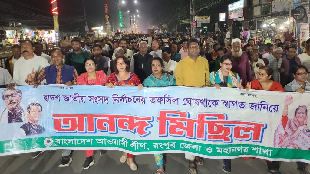 এছাড়া রংপুর মহানগরীতে তফসিল ঘোষণার পরই মিছিল বের করেছে জেলা ও মহানগর আওয়ামী লীগ নেতাকর্মীরা। মিছিলটি নগরীর বেতপট্টি থেকে শুরু হয়ে বিভিন্ন জায়গা প্রদক্ষিণ করে দলীয় কার্যালয়ে গিয়ে শেষ হয়।
