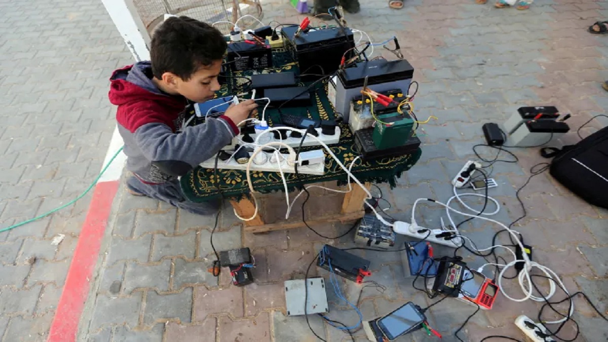 ব্যাটারি থেকে মোবাইল ফোন চার্জ করছে একজন ফিলিস্তিনি বালক। ছবি: আল জাজিরা।