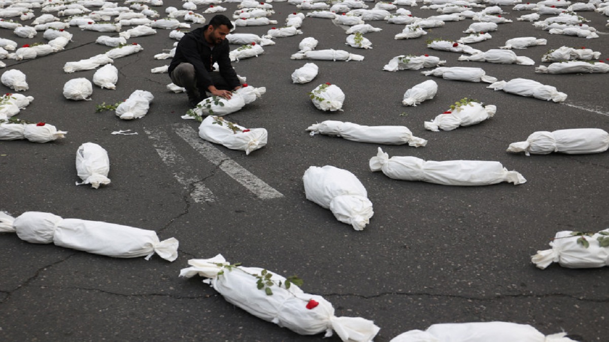 তেহরানের রাস্তায় একজন ইরানী ব্যক্তি গাজায় নিহত শিশুদের মৃতদেহের প্রতীকী কাফনে ফুল দিচ্ছেন। ছবি: জেরুজালেম পোস্ট।