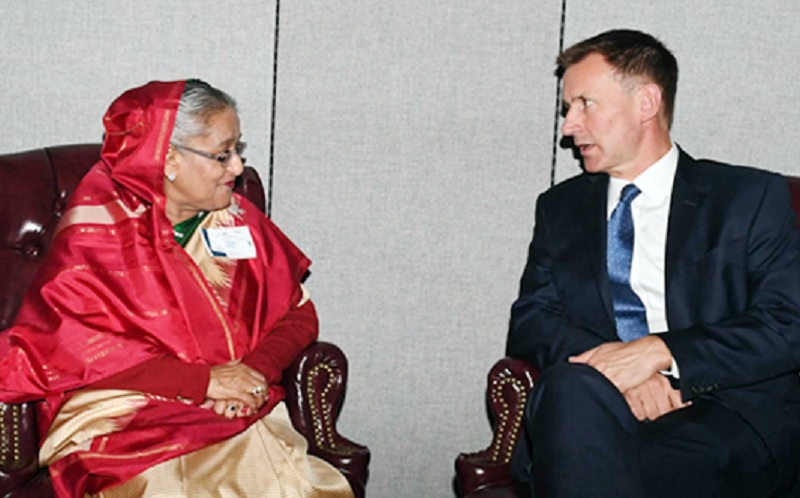 যুক্তরাজ্যের পররাষ্ট্র ও কমনওয়েলথ বিষয়ক মন্ত্রী জেরেমি হান্ট সোমবার সকালে জাতিসংঘ সদর দপ্তরের দ্বিপক্ষীয় বৈঠক কক্ষে প্রধানমন্ত্রীর সঙ্গে সাক্ষাতকালে প্রধানমন্ত্রী একথা বলেন। বৈঠকের পরে পররাষ্ট্র সচিব শহিদুল হক সাংবাদিকদের ব্রিফিং করেন।