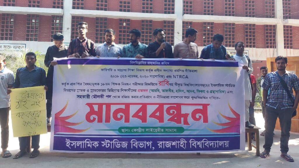 বেসরকারি শিক্ষক নিবন্ধন ও প্রত্যয়ন কর্তৃপক্ষ (এনটিআরসিএ) নীতিমালা সংশোধনের দাবিতে রাজশাহী বিশ্ববিদ্যালয়ের (রাবি) ইসলামিক স্টাডিজ বিভাগের শিক্ষার্থীরা মাববন্ধন করেছে।