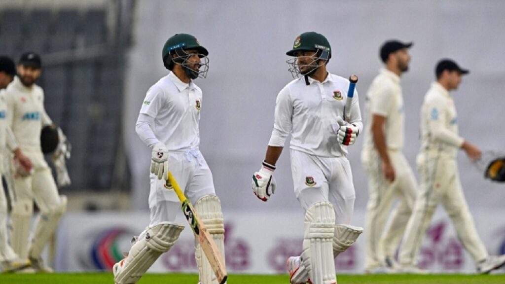 ইনিংসের শুরুতে উইকেট হারিয়ে বিপাকে পড়া বাংলাদেশকে উদ্ধারের দায়িত্বটা কাঁধে নেন নাজমুল হোসেন শান্ত ও জাকির হাসান। প্রতিপক্ষের বোলারদের উইকেট তুলে নেয়ার সুবিধা না দিয়ে উল্টো আক্রমণ শুরু করেন শান্ত। তবে সতর্কতা মেনেই ঝুঁকি নিচ্ছিলেন তিনি। কিন্তু টিম সাউদির বিপক্ষে মিড অফের ওপর দিয়ে মারতে গিয়ে কেন উইলিয়ামসনের তালুবন্দি হন বাংলাদেশ অধিনায়ক। এরপর মুমিনুল হক ক্রিজে এলেও এক বল পরই আলোর সল্পতায় আপাতত খেলা বন্ধ হয়ে যায়। আকাশ পরিস্কার না হওয়ায় বিকাল সোয়া চারটার দিকে দিনের খেলার ইতি টানা হয়।