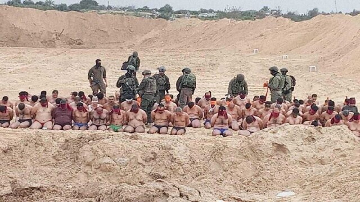 ফিলিস্তিনি বন্দিদের অর্ধনগ্ন করে নির্যাতন তল্লাশি চালাচ্ছে ইসরায়েলি বাহিনী। ছবি: টাইমস অব ইসরায়েল।