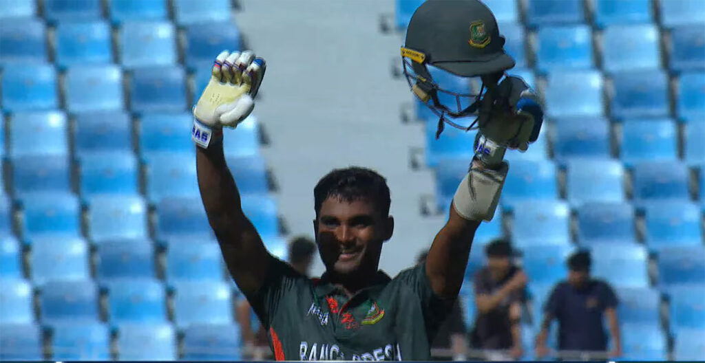 তবে সেমিফাইনালে ভারতের বিপক্ষে মাত্র ৭ রানেই কাটা পড়েন রানআউটে। ফাইনালের বড় মঞ্চে আবার শতক তুলে নিয়ে নিজের আগমনী বার্তা দিয়ে রাখলেন এই তরুণ। এই প্রতিবেদন লেখার সময় তিনি অপরাজিত ছিলেন ১১৮ রানে। আর বাংলাদেশের দলীয় সংগ্রহ ৪৫ ওভারে ৩ উইকেটে ২৪৫ রান।