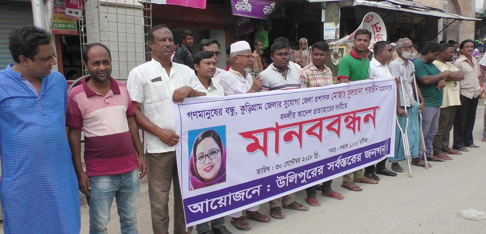 কুড়িগ্রামের জেলা প্রশাসক সুলতানা পারভীনের বদলি আদেশ প্রত্যাহারের দাবিতে মানববন্ধন করেছে এলাকাবাসী। আজ সকালে কুড়িগ্রাম চিলমারী সড়কের উলিপুরের গবার মোড়ে এই কর্মসূচি পালিত হয়। প্রচন্ড রোদ উপেক্ষা করে বিভিন্ন শ্রেণি পেশার মানুষ এ মানব বন্ধনে অংশ নেয়।