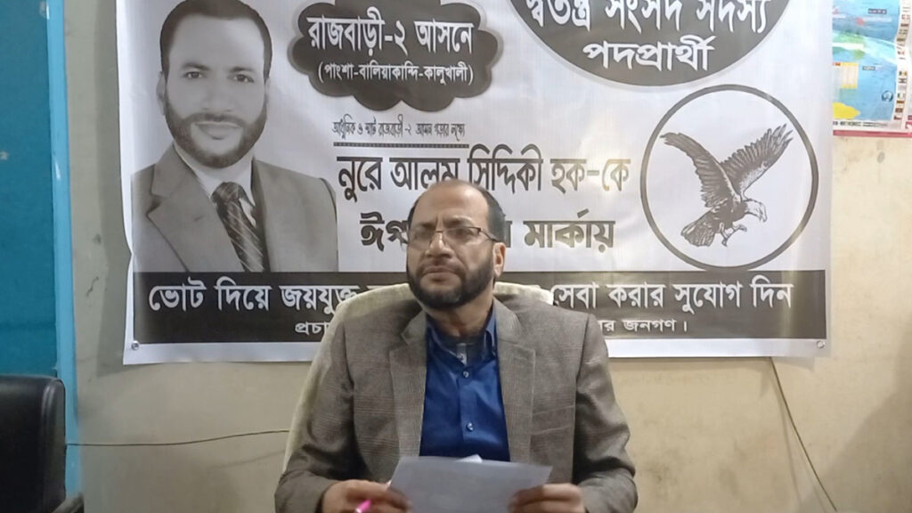 প্রচারণায় বাধা, ভয়ভীতি, হুমকি-ধামকিসহ নানা ষড়যন্ত্রের অভিযোগে সাংবাদিক সম্মেলন করেছেন রাজবাড়ী-২ সংসদীয় আসনের ঈগল প্রতীকের স্বতন্ত্র প্রার্থী কেন্দ্রীয় কৃষক লীগের সাংগঠনিক সম্পাদক নূরে আলম সিদ্দিকী হক। মঙ্গলবার (২ জানুয়ারি) দুপুর আড়াইটার দিকে রাজবাড়ী শহরে তিনি এ সাংবাদিক সম্মেলন করেন।