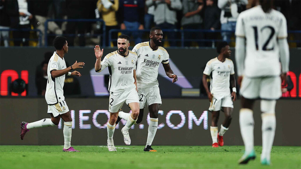 ৮ গোলের রোমাঞ্চে প্রথম সেমিফাইনালে অ্যাটলেটিকো মাদ্রিদকে ৫-৩ গোলে হারিয়েছে রিয়াল মাদ্রিদ। শেষ সময়ের দুই গোলে নগর প্রতিদ্বন্দ্বীদের হারিয়ে স্প্যানিশ সুপার কাপের ফাইনাল নিশ্চিত করে আনচেলত্তির শিষ্যরা।