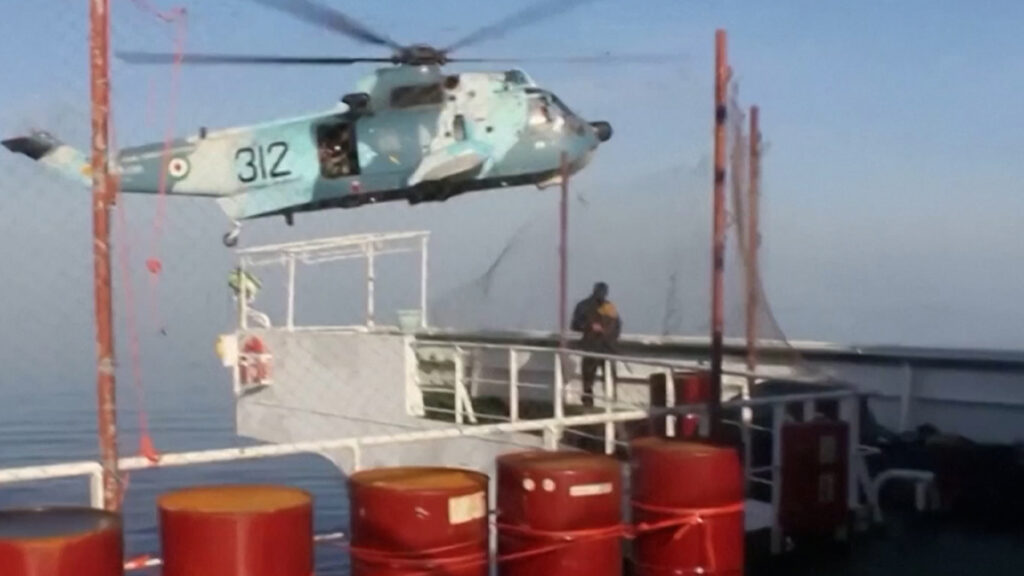 প্রতিবেদনে বলা হয়, হেলিকপ্টার নিয়ে তাড়া করে নৌযানটির কাছে পৌঁছায় নিরাপত্তা বাহিনীর সদস্যরা। নেমেই অস্ত্রের মুখে জিম্মি করে ক্রু’দের। পরে তাদের নির্দেশে জাহাজটি পরিচালনা করা হয় তেহরানের দিকে।