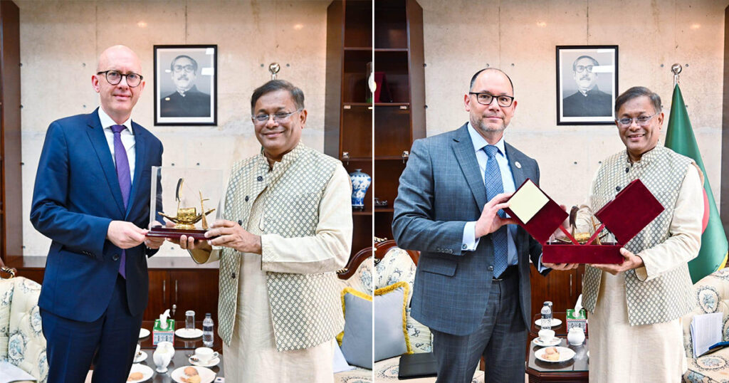 ঢাকায় নিযুক্ত ইউরোপীয় ইউনিয়ন (ইইউ) চার্লস হোয়াইটলি এবং মার্কিন রাষ্ট্রদূত পিটার হাসকে নৌকা উপহার দিলেন পররাষ্ট্রমন্ত্রী ড. হাছান মাহমুদ। বুধবার (১৭ জানুয়ারি) পররাষ্ট্রমন্ত্রীর সঙ্গে সৌজন্য সাক্ষাৎ করতে মন্ত্রণালয়ে যান দুই রাষ্ট্রদূত। এ সময় তাদেরকে আওয়ামী লীগের মার্কা নৌকা উপহার দেয়া হয়।