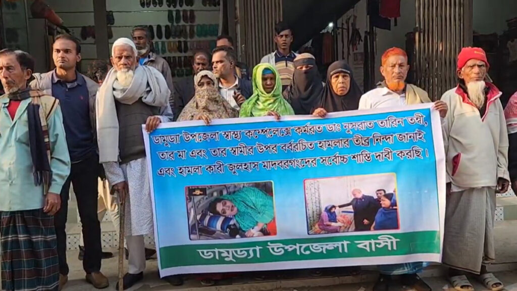 শরীয়তপুরের ডামুড্যা উপজেলা স্বাস্থ্য কমপ্লেক্সের সহকারী সার্জন ডা. নুসরাত তারিন তন্বী ও তার পরিবারের ওপর হামলাকারীদের সর্বোচ্চ বিচার দাবি করেছেন এলাকাবাসী। এ দাবিতে শনিবার (১০ ফেব্রুয়ারি) বিকেলে উপজেলার শিধলকুড়া বাজারে মানববন্ধন কর্মসূচি পালিত হয়।