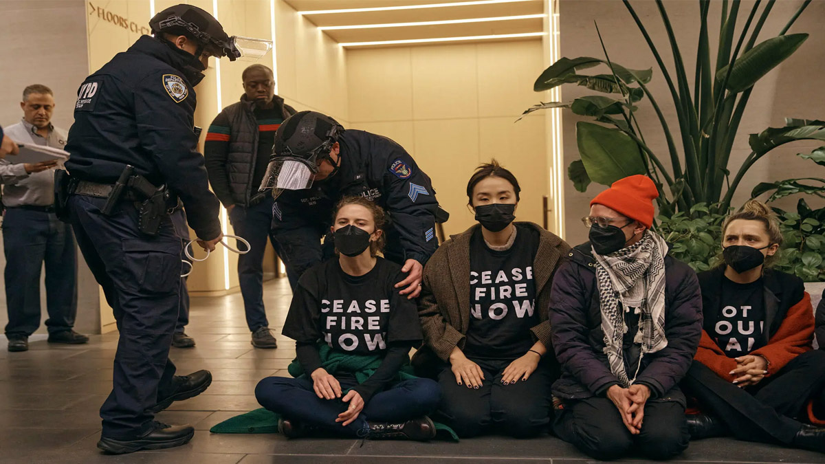 যুদ্ধবিরতির দাবি জানিয়ে বিক্ষোভকারীরা ম্যানহাটনের অফিস বিল্ডিংয়ে সিনেটরদের উদ্দেশ্যে স্লোগান দেয়। পরে তাদের আটক করা হয়। ছবি: দ্য নিউ ইয়র্ক টাইমস।