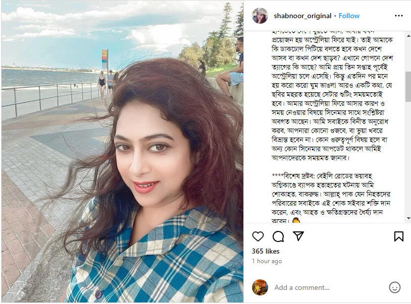 পোস্ট অনুযায়ী শাবনূরের ভাষ্য, লক্ষ্য করছি, আমার অস্ট্রেলিয়া ফিরে আসাকে কেন্দ্র করে মিডিয়াতে বিভ্রান্তিকর খবর, দেখেশুনে মনে হচ্ছে উদ্দেশ্যপ্রণোদিত ভুয়া গুজব ছড়ানো হচ্ছে।