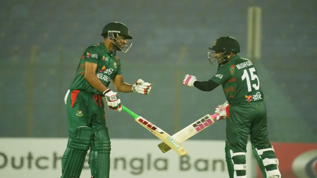 অধিনায়ক শান্তর ব্যাট থেকে আসে অপরাজিত ১২২ রান। অপরদিকে মুশফিকুর রহিমের অপরাজিত ৭৩ ও মাহমুদউল্লাহর ৩৭ রানে ভর করে জয়ের বন্দরে পৌঁছে যায় বাংলাদেশ।