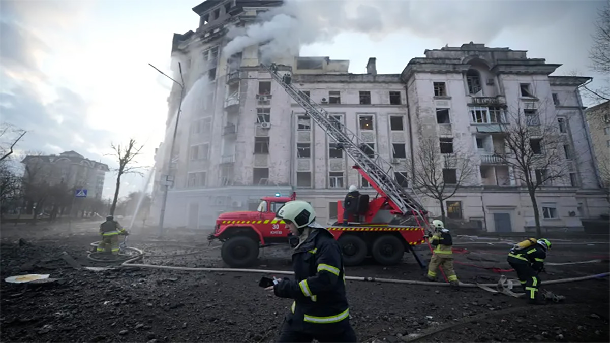 কিয়েভে রুশ হামলার পর ক্ষতিগ্রস্ত একটি ভবনের সামনে কাজ করছেন দমকলকর্মীরা। ছবি: এপি