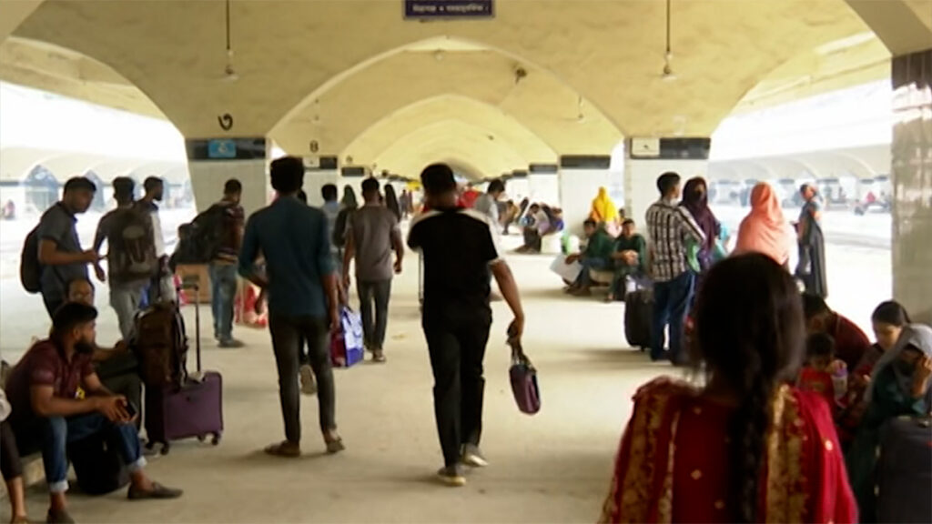 ট্রেনে ঈদ যাত্রার চতুর্থ দিনে ঢাকা রেলওয়ে স্টেশনে যাত্রীদের ভিড় বাড়ছে। নাড়ির টানে বাড়ি ফিরছেন রাজধানীবাসী।