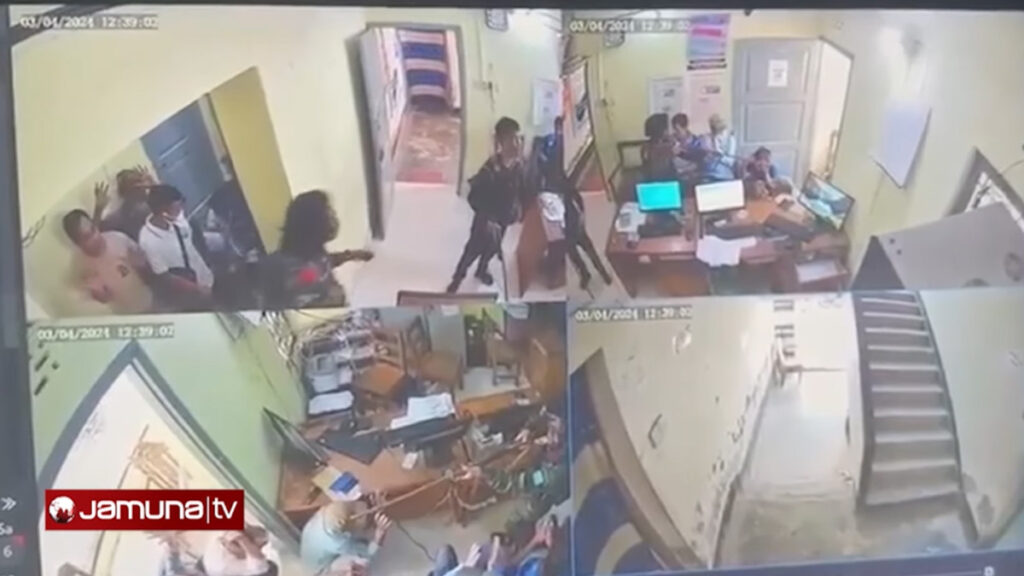 এসময়, পাশে কয়েকজন ব্যাংকের সাধারণ গ্রাহকও ছিলেন। তাদের হাত উঁচিয়ে দাড় করিয়ে রাখতে দেখা যায়। একপর্যায়ে বন্দুক দিয়ে আঘাত করে একটি ক্যামেরা বন্ধ করে দেন তাদের একজন সদস্য। অন্য ক্যামেরাগুলোতে দেখা যায় ব্যাংক কর্মকর্তারা বসে হাত উঁচু করে আছেন। আর একজন তল্লাশি করে একটি ব্যাগে সব নিয়ে নিচ্ছেন। এরমধ্যে ভেতর থেকে বাইরে আনাগোনাও করছিলেন কয়েকজন সদস্য।