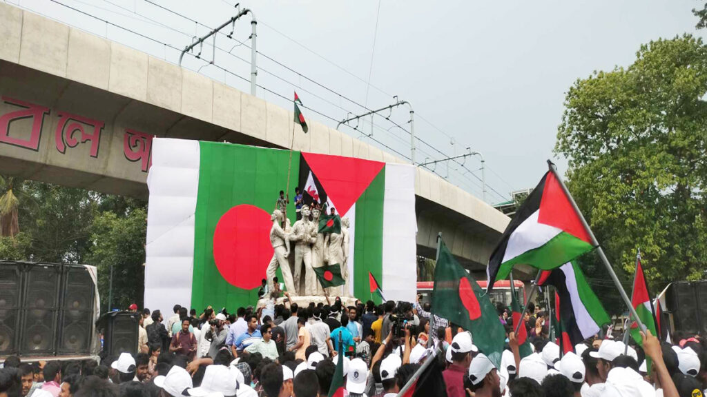 স্বাধীন রাষ্ট্র হিসেবে ফিলিস্তিনকে স্বীকৃতি দেয়ার দাবিতে পতাকা উত্তোলন কর্মসূচি পালন করছে বাংলাদেশ ছাত্রলীগ। সোমবার (৬ মার্চ) সকাল থেকে ঢাকা বিশ্ববিদ্যালয়ের মধুর ক্যান্টিনের সামনে জানানো হয় এই সংহতি। দলীয় নেতাকর্মী ছাড়াও কর্মসূচিতে অংশ নেন সাধারণ শিক্ষার্থীরা।