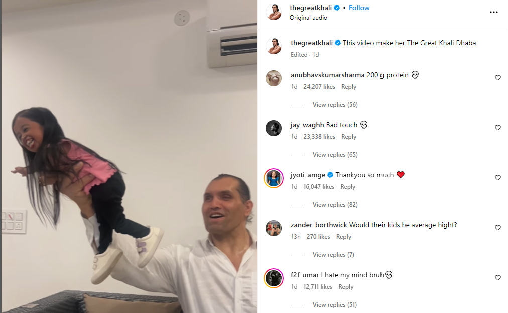 ভিডিওতে খালি জ্যোতিকে এক হাতে তুলে, কখনও তুলেছেন আর নামাচ্ছেন। আর জ্যোতি এতে খিল খিল করে হাসছেন। ভিডিওটি ইনস্টাগ্রামে প্রায় ৯২ মিলিয়ন মানুষ দেখেছে এবং প্রায় ২ মিলিয়নের ওপর লাইক পেয়েছে।