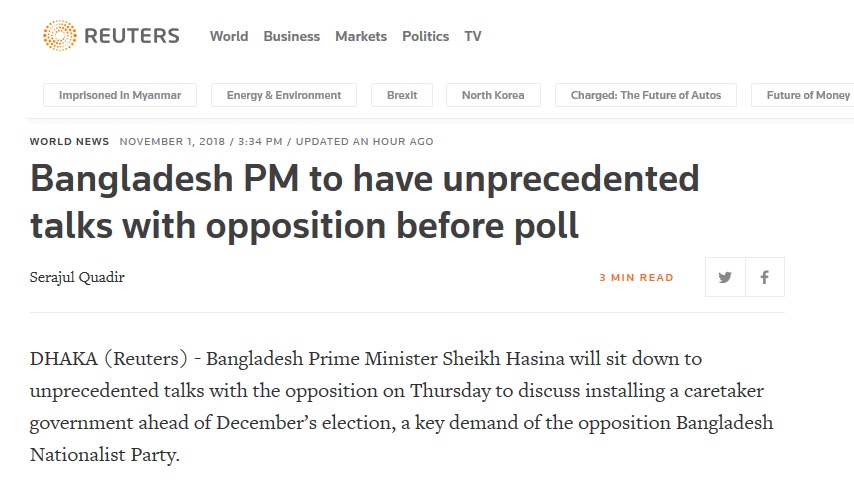 ব্রিটেন ভিত্তিক বার্তা সংস্থা রয়টার্স শিরোনাম করেছে ‘নির্বাচনের আগে বিরোধীদের সাথে বিরল সংলাপ করতে যাচ্ছেন বাংলাদেশের প্রধানমন্ত্রী’। (Bangladesh PM to have unprecedented talks with opposition before poll).