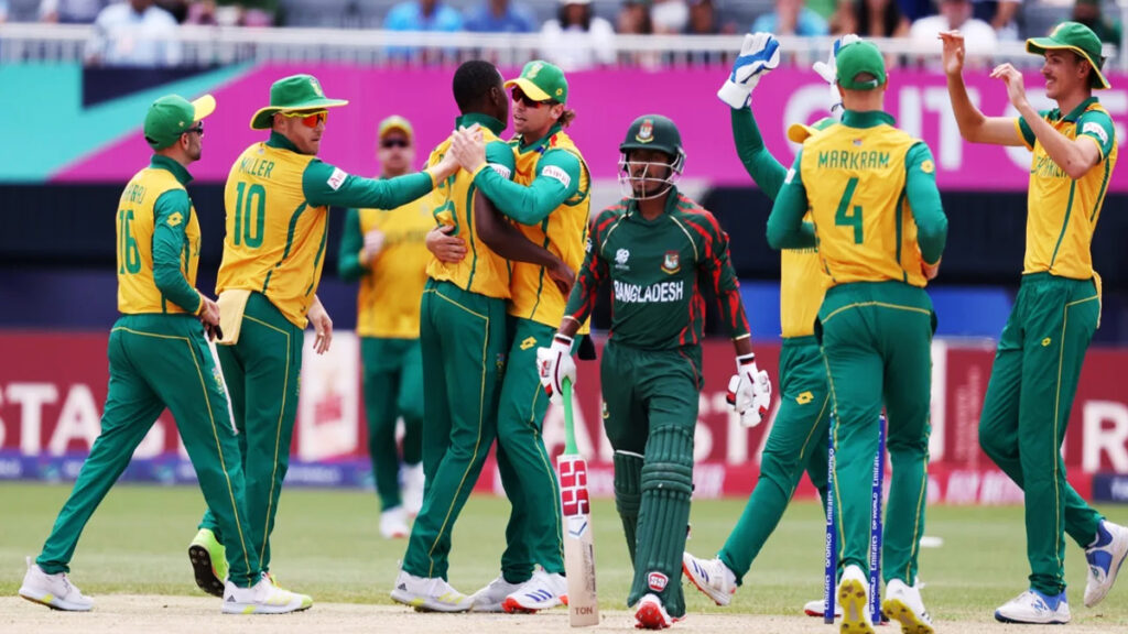 টি-টোয়েন্টি বিশ্বকাপে নিজেদের দ্বিতীয় ম্যাচে শক্তিশালী দক্ষিণ আফ্রিকার মুখোমুখি হয়েছে বাংলাদেশ। টসে জিতে আগে ব্যাট করতে নেমে টাইগার পেসার তানজিম সাকি১১৩ রানের বেশি করতে পারেনি প্রোটিয়ারা।মাত্র ২৩ রানের মধ্যে ৪ উইকেট হারিয়ে পর্যয়ে পরে প্রোটিয়ারা। লক্ষ্য তাড়ায় শুরুতেই তানজিদ হাসান তামিমের উইকেট হারায় বাংলাদেশ। এরপর পাওয়ারপ্লে’তে ধীরগতিতে আগাতে থাকে লিটন দাস ও নাজমুল শান্ত। তবে মহারাজের বলে ক্যাচ দিয়ে ফেরেন লিটন। ক্রিজে এসে বেশিক্ষন টিকতে পারেননি সাকিব আল হাসানও। বাংলাদেশকে চাপে ফেলে বিদায় নেন ৩ রান করা সাকিব।