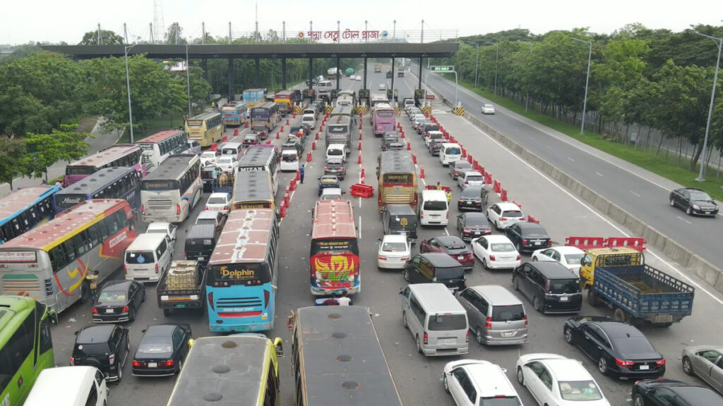 স্বাভাবিক সময়ের চেয়ে যানবাহনের চাপ বেড়ে যাওয়ায় পদ্মা সেতুর টোল প্লাজায় যানবাহনগুলোকে টোল দিতে দীর্ঘসময় অপেক্ষা করতে হচ্ছে। সেতু এলাকায় ধীরগতিতে চলছে যানবাহন। তবে মহাসড়কে তেমন কোনো ভোগান্তি নেই। অন্যান্য যানবাহনের তুলনায় মোটরসাইকেলের বাড়ির পথে রওনা দেয়া যাত্রীদের ব্যাপক উপস্থিতি দেখা গেছে টোল প্লাজায়।