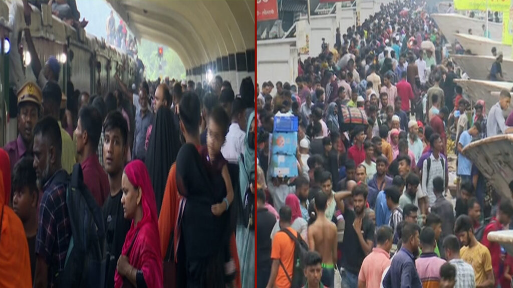এদিকে নৌপথে ঢাকা ছাড়ার জন্য রাজধানীর সদরঘাট লঞ্চ টার্মিনালেও ভিড় দেখা গেছে যাত্রীদের। লঞ্চের ছাদেও চেপে বসেছেন অনেকে। তবে নির্দিষ্ট কোনো সময় মেনে ছাড়ছে না লঞ্চগুলো।