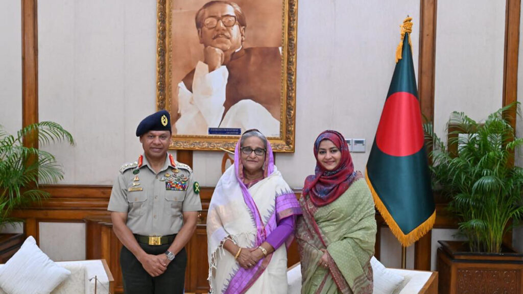 বৃহস্পতিবার (২০ জুন) সকালে প্রধানমন্ত্রীর সরকারি বাসভবন গণভবনে এ সৌজন্য সাক্ষাত অনুষ্ঠিত হয়। এ সময় বিদায়ী সেনাবাহিনীর প্রধানের পরিবারের সদস্যরাও উপস্থিত ছিলেন।
