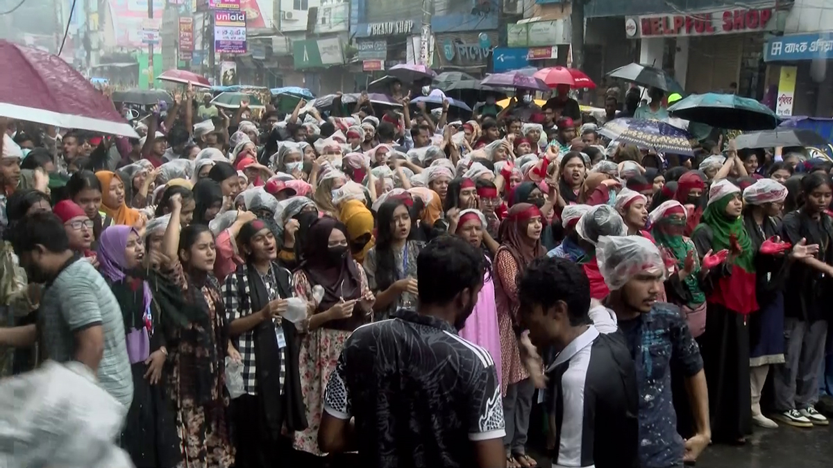 বৃষ্টিতে কাকভেজা হয়ে রংপুরে আবু সাঈদসহ নিহত সকল হত্যার সুষ্ঠু বিচার এবং ৯ দফা দাবি আদায়ের লক্ষ্যে বিক্ষোভ ও দ্রোহযাত্রা করছে বিশ্ববিদ্যালয়, মেডিকেল, কলেজ ও স্কুলের শিক্ষার্থীরা। তাদের মধ্যে নারী শিক্ষার্থীদের সংখ্যাই বেশি। সকাল ১১টায় শুরু হওয়া দ্রোহযাত্রা চলছে এখনও।