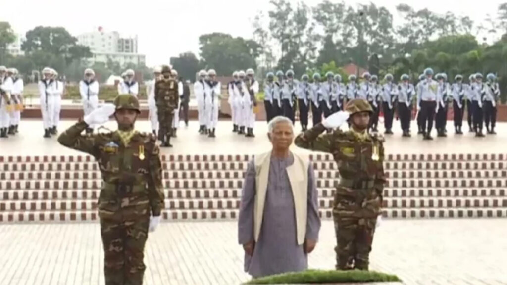 প্রধান উপদেষ্টা হিসেবে শ্রদ্ধা নিবেদনের পর উপস্থিত ১৩ উপদেষ্টাকে সঙ্গে নিয়ে জাতীয় স্মৃতিসৌধে শ্রদ্ধা নিবেদন করেন ড. মুহাম্মদ ইউনূস। এসময় তিন বাহিনীর একটি চৌকস দল প্রধান উপদেষ্টাকে গার্ড অব অনার প্রদান করেন। বিউগলে বেজে ওঠে করুণ সুর।